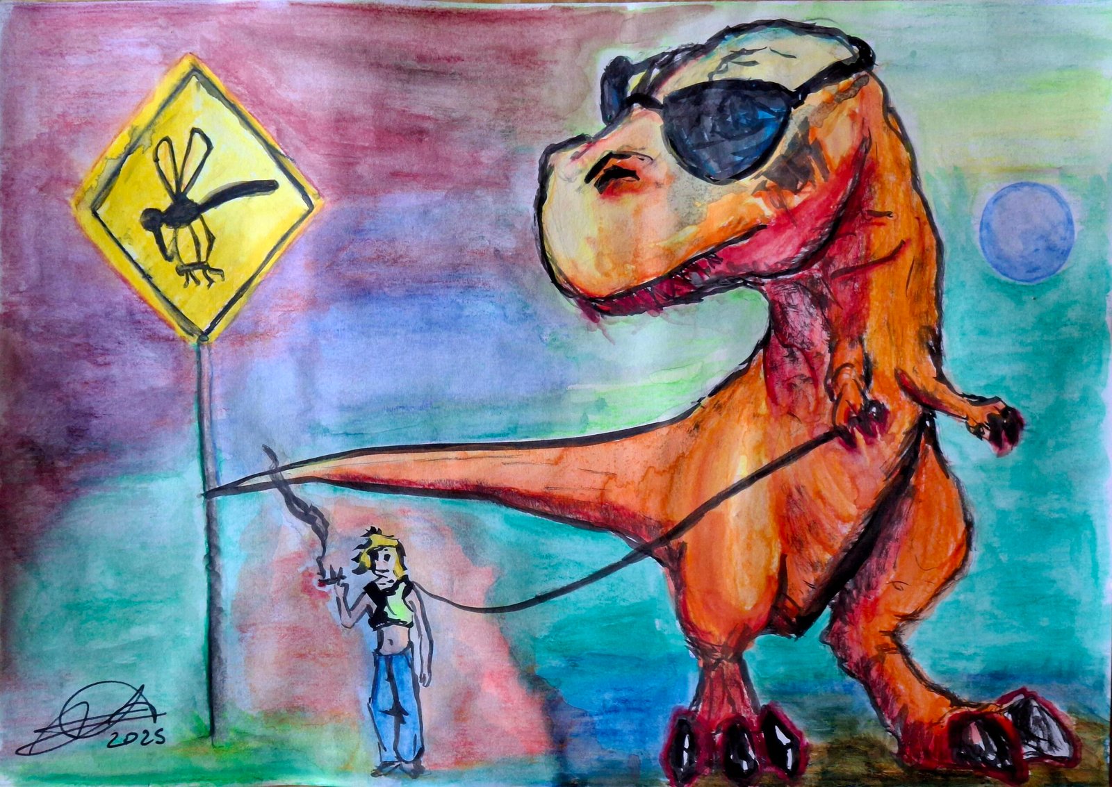 Paseo Jurassic es una obra que utiliza técnicas mixtas, incluyendo lápiz, color y acuarela, y nos invita a reflexionar sobre la naturaleza cambiante de la vida y las diferentes perspectivas que se pueden tener ante una misma situación.